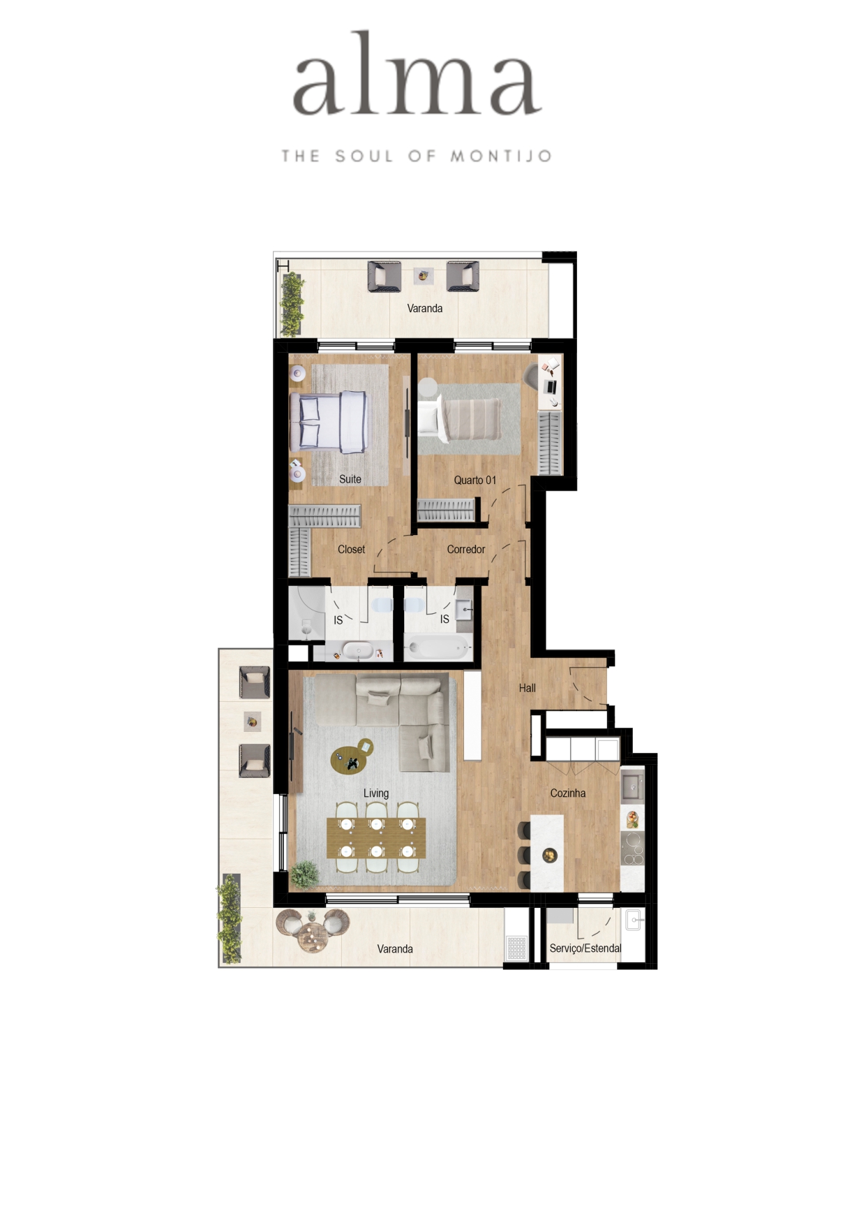 Sala e cozinha em open space, com ligação direta à varanda 41 m / 1 Suite com closet 16,40 m / Casa de banho com duche da suite 4,40 m / Quarto com roupeiro 13,70 m / 1 Casa de banho com banheira 3 m / Varanda partilhada com todos os quartos 14,80 m / Varanda que acompanha toda a sala 19 m / Hall 6,80 m / Zona de lavandaria 3,50 m / Estacionamento / Arrecadação 7 m